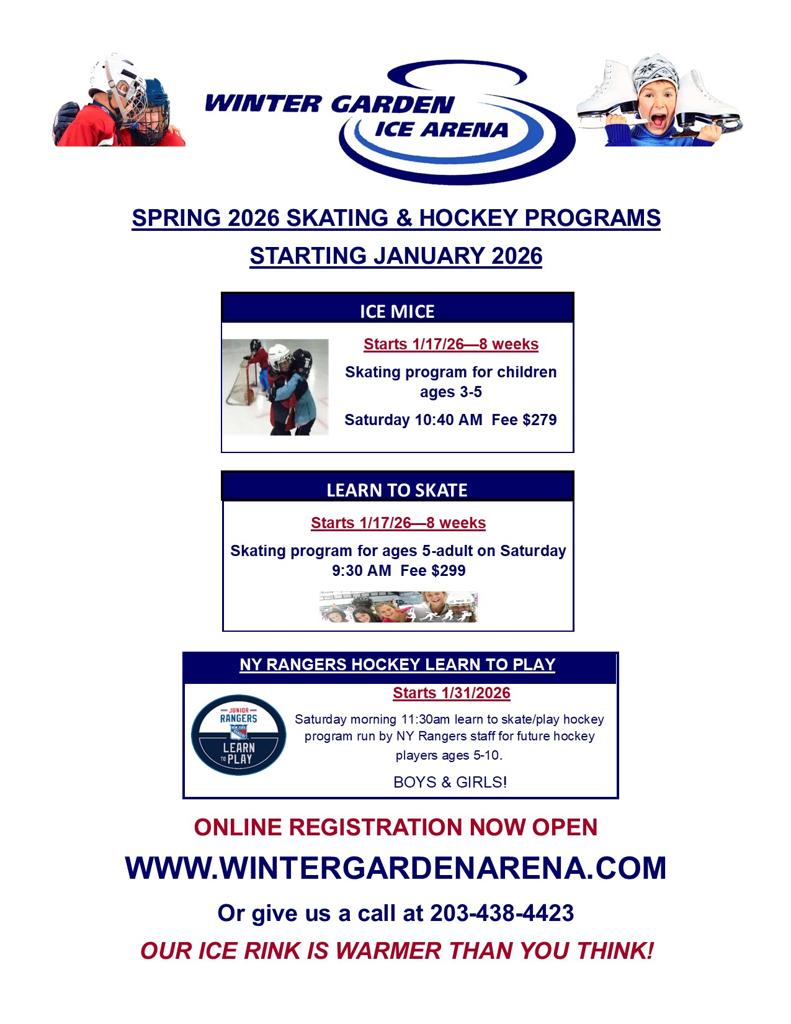 For inquiries about Winter Garden Ice Arena programs or schedule contact the main office at 203-438-4423